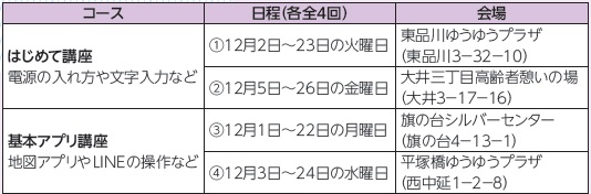 申込み:11月4日(火)(必着)までに、電話かはがき、FAXで希望番号、会場名、住所、氏名(ふりがな)、年齢、電話番号を品川区スマホ体験教室・よろず相談事務局(〒351-0101 埼玉県和光市白子1-3-40-4階【電話】0120-616-614〔土・日曜日、祝日を除く午前9時~午後5時〕【FAX】048-461-8486)へ