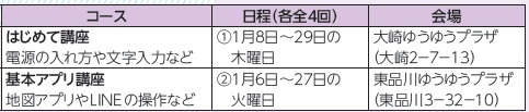 対象・定員:区内在住で、スマートフォンを持っていないか、ほとんど使ったことがない60歳以上の方各12人程度(抽選)