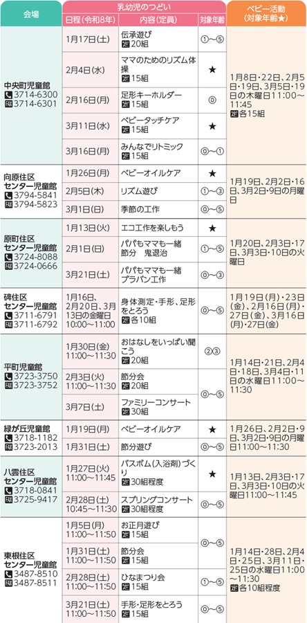 令和7年4月2日以降生まれの乳児と保護者を対象に、育児についての交流や仲間作りの場として、乳児活動を開催します。参加を希望するかたは、各児童館へお問い合わせください。