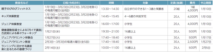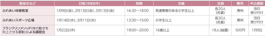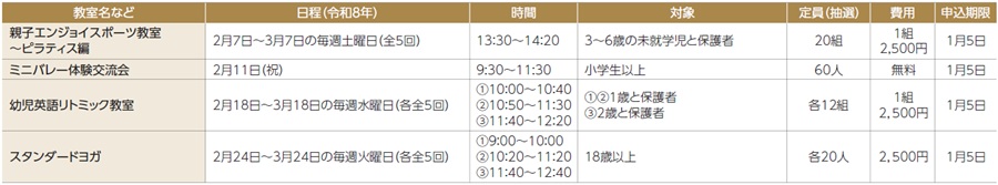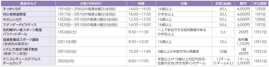 申込み:各申込期限までに、区ウェブサイト/FAX/ハガキ(希望教室・イベント名[時間を選ぶものは希望時間]、郵便番号・住所、氏名[ふりがな]、電話・FAX、年齢、学年、在勤・在学・在園者は所在地・名称)/窓口