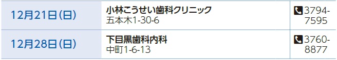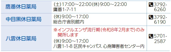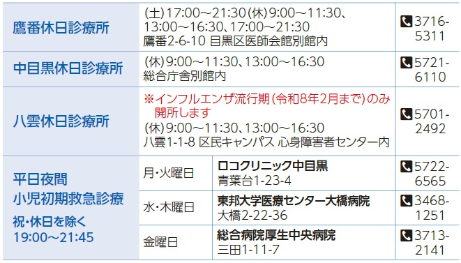 年末年始(12月29日~令和8年1月4日)と、1月14日までの休日・土曜日・平日夜間の診察・調剤案内は、めぐろ区報令和8年1月1日号(12月26日までに配布)でお知らせします。