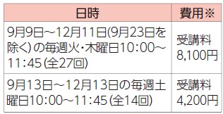 日時:9月12日(金)9:45~15:30、9月24日(水)・10月1日(水)9:30~15:30(全3回)