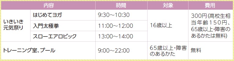 敬老の日(9月15日)限定で、65歳以上のかたが無料で利用できる体育館イベントです(一部対象が異なります)。希望者は当日会場へお越しください。