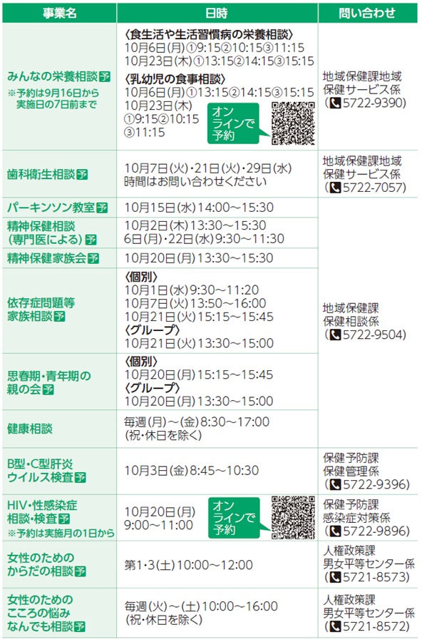 健康 10月の健康相談など 24/36 前の記事 次の記事 発行日 : 2025年09月15日 自治体名 : 東京都目黒区 広報紙名 : めぐろ区報 令和7年9月15日号 [予]=予約制 Tweet シェアする スマートフォンが苦手なかたへ 日曜・祝・休日、土曜日、平日夜間などの診療・調剤案内