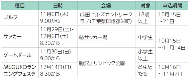 対象:区内在住・在勤・在学者、目黒体育協会の加盟団体(学生連盟加入者を除く)