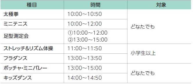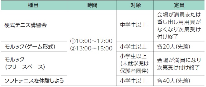 (受け付けは開始5分前から終了時間まで。屋内用運動シューズを持参)