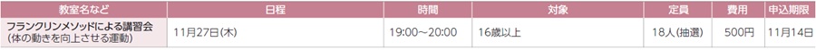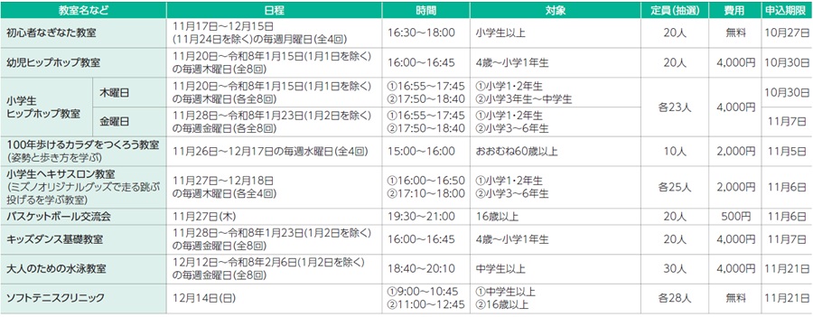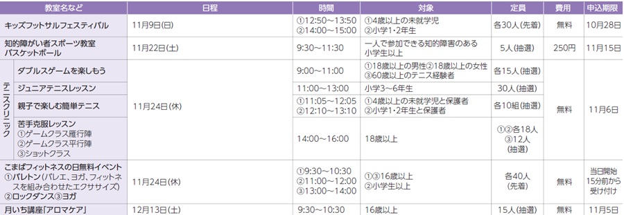 各申込期限までに、区ウェブサイ/FAX/ハガキ(希望教室・イベント名[時間を選ぶものは希望時間]、郵便番号・住所、氏名[ふりがな]、電話・FAX、年齢、学年、在勤・在学・在園者は所在地・名称)/窓口