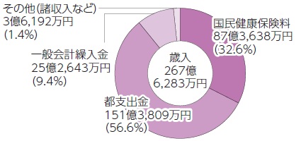 歳入は、国民健康保料と都からの支出金(保険給付費等交付金)が大半を占めています。