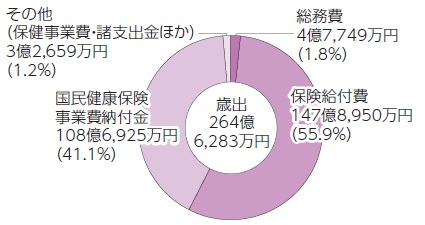 歳出は、区が負担した医療費(保険給付費)と区から都へ納付する国民健康保険事業に要する経費(国民健康保険事業費納付金)が大半を占めています。