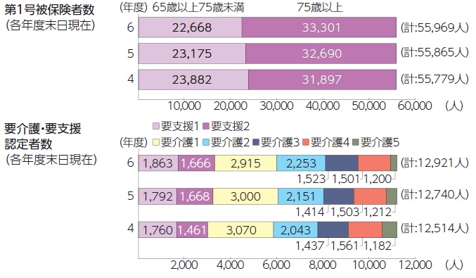第1号被保険者(65歳以上のかたが対象)の数は、令和6年度末現在55,969人で、前年同時期よりも104人増加しました。