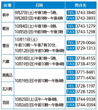 申込方法:電子申請。問合先へ往復はがき(記入例参照)も可。(オンライン希望は電子申請のみ)〔1〕9月8日〔2〕10月10日必着