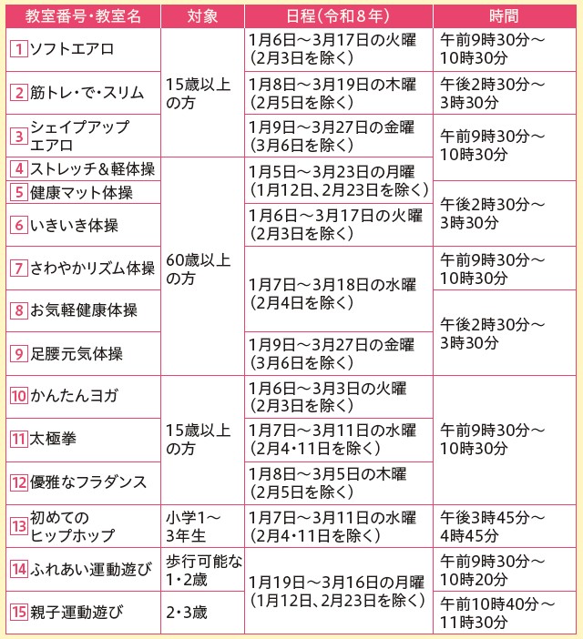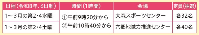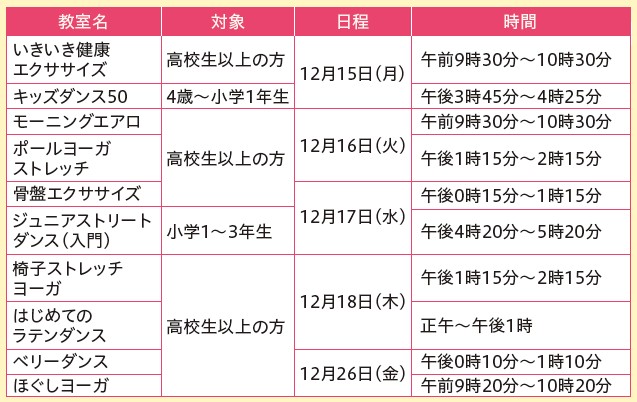 申込方法:電子申請。問合先へ電話かFAX(記入例参照。〔1〕〔4〕〔11〕は希望時間も明記)も可。1名1教室。12月4日締め切り
