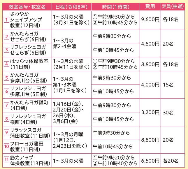 申込方法:問合先へ往復はがき(記入例参照。教室番号・教室名も明記)。1名1教室。12月5日消印有効