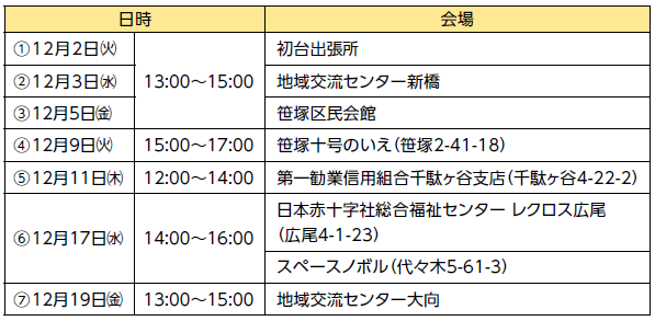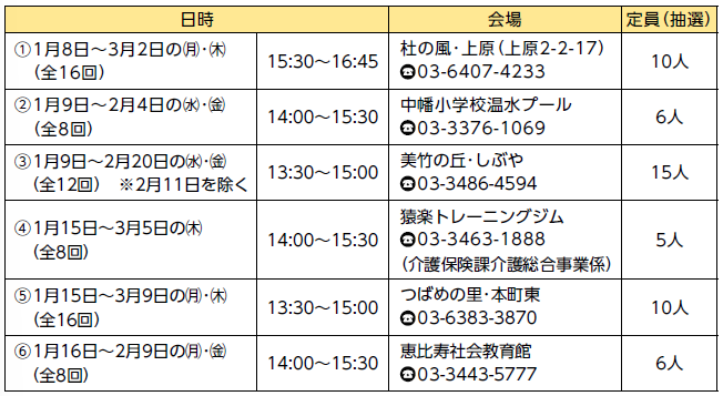 申込:(1)・(5)・(6)は12月1~15日、(2)・(3)・(4)は12月2~16日に電話で各会場へ