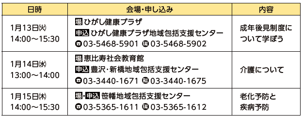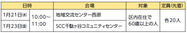 申込:12月17日から電話で総合ケアコミュニティ・せせらぎ地域包括支援センター(【電話】03-5790-0881)へ