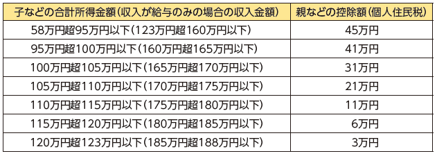 8年度特別区民税・都民税(個人住民税)から、19歳以上23歳未満で合計所得金額が58万円超123万円以下の生計を一にする特定親族がいる納税義務者について、所得に応じて段階的に控除を受けられる制度が新たに始まります。なお、この制度の対象者は扶養親族には該当しません。