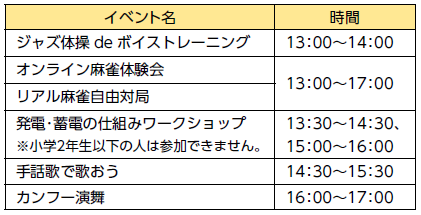 内容:琴の演奏、つまみ細工・食品サンプル作り、日本舞踊の体験、映画上映など