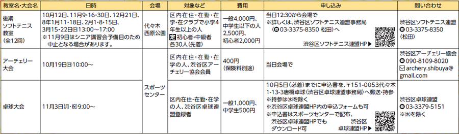 スポーツ 【スポーツ】秋季区民スポーツ大会・教室 18/41 前の記事 次の記事 発行日 : 2025年10月01日 自治体名 : 東京都渋谷区 広報紙名 : しぶや区ニュース 令和7年(2025年)10月1日号 問合せ:学びとスポーツ課スポーツ振興係 【電話】03-3463-3295【FAX】03-3463-3822 Tweet シェアする 【スポーツ】ピックルボール渋谷カップ2025 【スポーツ】思わず身体を動かしたくなる街へ。