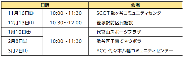 申込:(1)11月3日10:00から、(2)・(3)随時、渋谷スポーツ共育プラザandラボ“すぽっと”HPで
