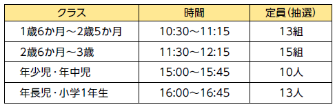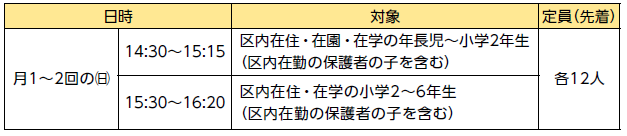 対象:区内在住・在園・在学の1歳6か月~小学1年生(区内在勤の保護者の子を含む、1歳6か月~3歳のクラスは親子で参加)