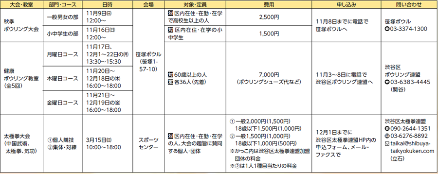 スポーツ 【スポーツ】スポーツ大会・教室 22/44 前の記事 次の記事 発行日 : 2025年11月01日 自治体名 : 東京都渋谷区 広報紙名 : しぶや区ニュース 令和7年(2025年)11月1日号 問合せ:学びとスポーツ課スポーツ振興係 【電話】03-3463-3295【FAX】03-3463-3822 Tweet シェアする 【スポーツ】北渋RunRunフェスタ2025開催に伴う交通規制のお知らせ 【防災・安全】令和7年度 渋谷区総合防災訓練