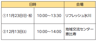 (1)11月22日10:00~11:00に会場で ※出店枠に空きがある場合のみ、12:00~16:00に電話で氷川地区リサイクルバザール実行委員会(【電話】080-3384-7555)へ