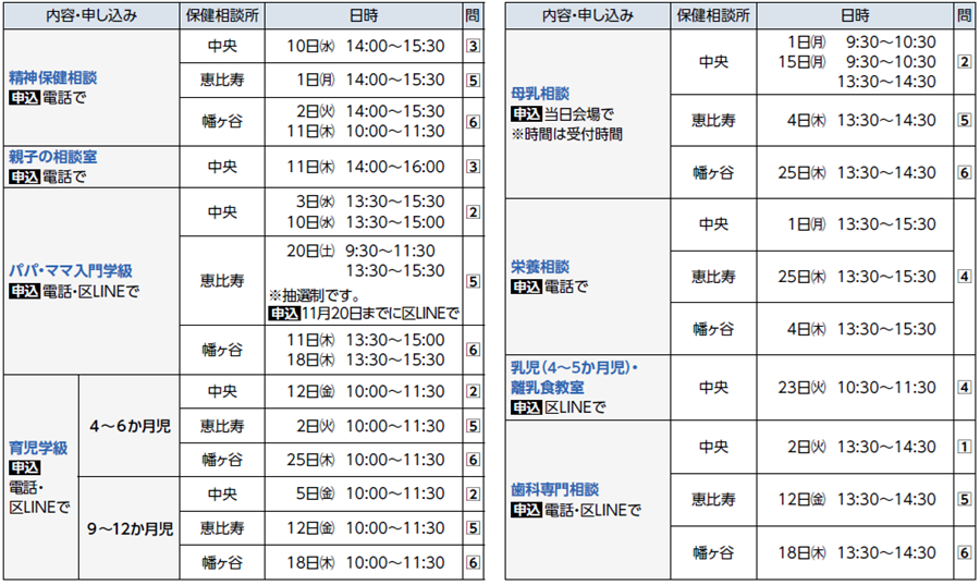 ※中央保健相談所の会場は、渋谷区子育てネウボラです。