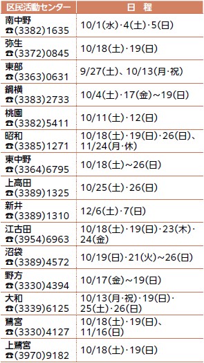 地域のみなさんによる手作りのお祭りです。詳しくは、各区民活動センター運営委員会HPまたは広報紙をご覧になるか、問い合わせを。