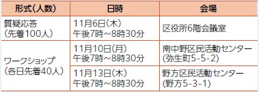 申込:10月6日〜各開催日の2営業日前までに電話、【Eメール】[email protected]、ファクスまたは直接、中野駅周辺まちづくり係へ。要約筆記・手話通訳・一時保育(各日先着2人)希望の方は、各開催日の5営業日前までにあわせて申し込みを。