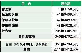 9月末の区債現在高は、340億4792万円です(対前年度比11億1412万円の減)。(表6)