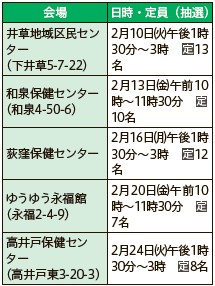 申込み:はがき(記入例)に希望会場(1カ所)も書いて、1月13日までに荻窪保健センター