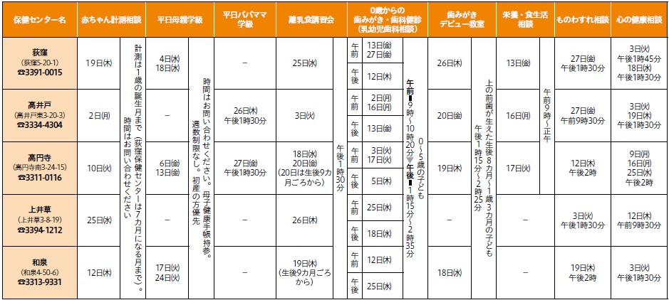 ※杉並区に転入し、妊婦・乳幼児健診受診票、予防接種予診票が必要な方は、各保健センターまたは地域子育て支援課母子保健係(区役所東棟3階)へ。会場は狭いためベビーカーで回ることができません。ベビーカーにチェーン錠をつけるなど各自でご注意ください。間違い電話が多くなっています。掛け間違いのないようご注意ください。