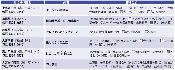 イベント ゆうゆう館の催し 49/72 前の記事 次の記事 発行日 : 2026年01月15日 自治体名 : 東京都杉並区 広報紙名 : 広報すぎなみ 令和8年1月15日号 No.2420号 ゆうゆう館は高齢者向け施設ですが、「対」に指定がなければどなたでも参加できます。 ※申し込み・問い合わせは、各ゆうゆう館へ。第3日曜日は休館。いずれも長寿応援対象事業。 Tweet シェアする イベントひろば「講演・講座」〔荻窪保健センター〕 感動をありがとう~「地域へつなぐデフリンピック」トークイベント