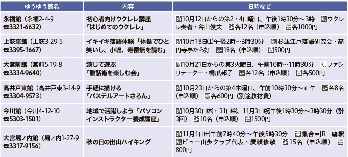 イベント ゆうゆう館の催し 38/70 前の記事 次の記事 発行日 : 2025年10月01日 自治体名 : 東京都杉並区 広報紙名 : 広報すぎなみ 令和7年10月1日号 No.2413号 ゆうゆう館は高齢者向け施設ですが、「対」に指定がなければどなたでも参加できます。 ※申し込み・問い合わせは、各ゆうゆう館へ。第3日曜日は休館です。いずれも長寿応援対象事業。 Tweet シェアする イベントひろば「催し」(2) イベントひろば「講演・講座(1)」
