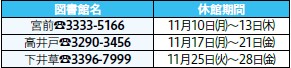 特別整理(蔵書点検)を行うため、下表のとおり臨時休館します。臨時休館中、当該図書館の本などは通常通り予約できますが、貸し出しまでに時間がかかる場合があります。