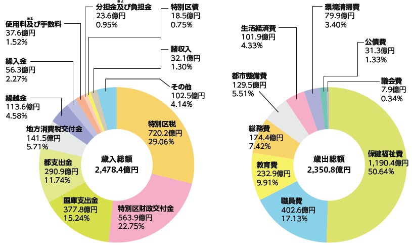 区の基幹的な歳入である特別区税や特別区財政交付金の増などにより、歳入は前年度と比して94億円(4.0%)の増となりました。