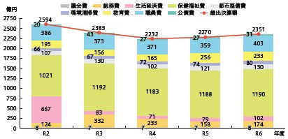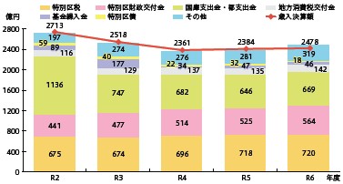 定額減税調整給付事業に伴う生活経済費の増や、定年引き上げによる退職手当などの支給に伴う職員費の増などにより、歳出は前年度と比して80億円(3.5%)の増となりました。