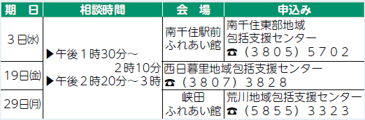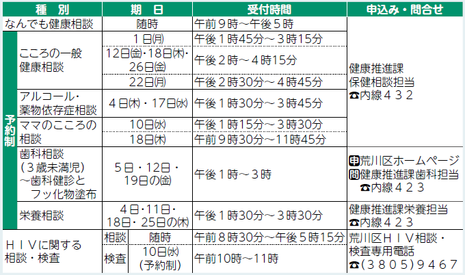 健康 9月の健康相談 20/33 前の記事 次の記事 発行日 : 2025年09月01日 自治体名 : 東京都荒川区 広報紙名 : あらかわ区報 令和7年9月1日号 会場:がん予防・健康づくりセンター ■ものわすれ相談(予約制) 対象:物忘れが気になる、65歳以上の方や家族等 ■難病相談室(予約制) 会場・申込み:荒川区医師会館(西日暮里6-5-3) 【電話】3893-2331 日時:9月20日(土)午後1時30分~3時 対象:神経難病の方、膠(こう)原病の方、その疑いのある方 内容:専門医・保健師・相談員等による在宅療養上の医療・福祉・介護相談 Tweet シェアする 子育てハッピー講座 ふれあい館の催し