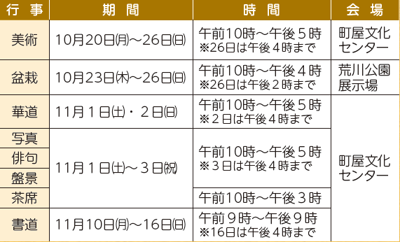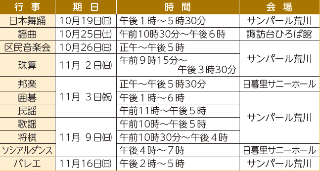 各文化団体の展示・発表の場です。詳細は、区役所3階生涯学習課、各区民事務所・図書館・ふれあい館等で配布するプログラムをご覧ください。