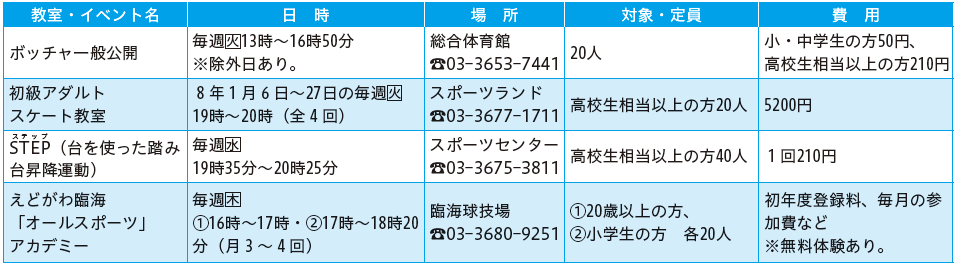 問合せ:各スポーツ施設(区HPに一覧)へ