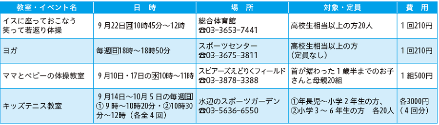 問合せ:各スポーツ施設(区HPに一覧)へ