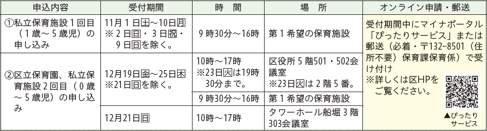 (1)10月17日(金)・(2)12月19日(金)から区HPと保育係窓口でお知らせします。