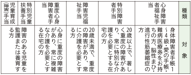 障害のある方や難病の方の生活を支援するため、左記の手当を支給しています。いずれも所得・年齢・入所などの制限があります。各手当の受給要件など、詳しくはお問い合わせいただくか、区HPをご覧ください。