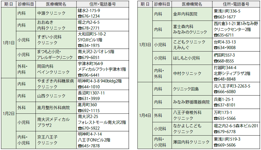 くらし 年始の休日救急診療の内科・外科・小児科(午前9時〜午後5時) 18/34 前の記事 次の記事 発行日 : 2025年12月15日 自治体名 : 東京都八王子市 広報紙名 : 広報はちおうじ 令和7年12月15日号 ※地図など、詳しくは1月1日号でお知らせします。 Tweet シェアする 医療情報ネットでは休日の眼科・耳鼻咽喉科もご案内しています 休日救急診療の内科・外科・小児科