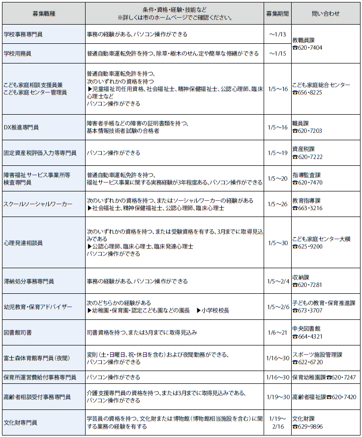 しごと 会計年度任用職員(専門職)を募集 7/39 前の記事 次の記事 発行日 : 2026年01月01日 自治体名 : 東京都八王子市 広報紙名 : 広報はちおうじ 令和8年1月1日号 4月から採用予定の市の会計年度任用職員(専門職)を下表のとおり募集します。対象や選考方法など、詳しくは市のホームページ(右の二次元コード(本紙参照))をご覧ください。 Tweet シェアする SNSでも情報発信中 市職員(任期付)も募集