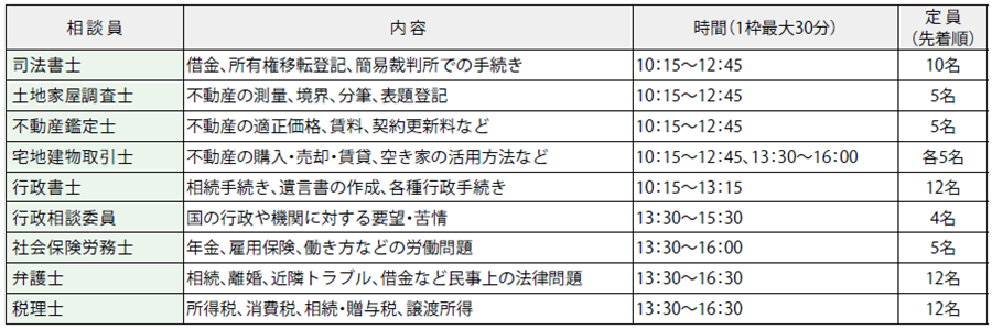 「相続」「離婚」「税金」「不動産」のことなど、あなたの困りごとに、下表のとおりさまざまな分野の専門家が相談に応じます。