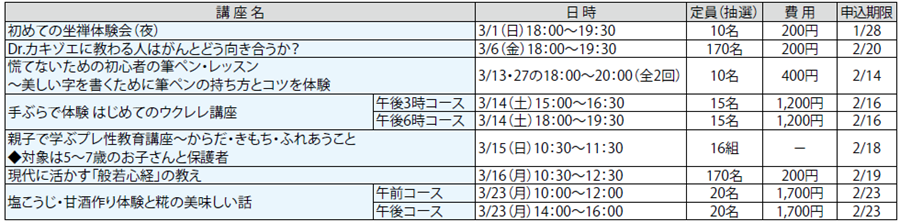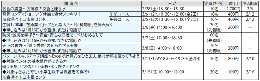 申し込み:往復ハガキ、またはメールに講座名(1講座1通1名のみ有効。コースが複数ある講座は希望コースも)と住所・氏名(ふりがな)・年齢・電話番号、市内在勤・在学の方はその旨、往復ハガキは返信面の宛名を書いて、申込期限(必着)までに各センターへ