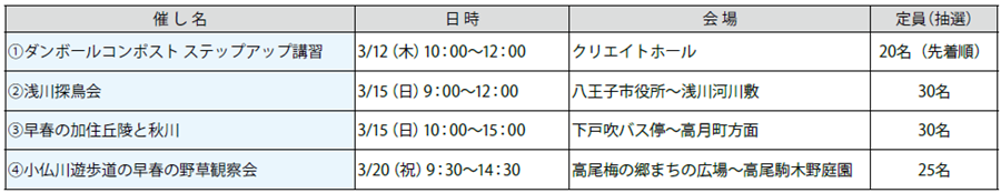申し込み:(1)2月15日から、(2)~(4)2月24日までに電話、または催し名と住所・氏名・電話番号を書いて、ファックス、メールでエコひろばへ