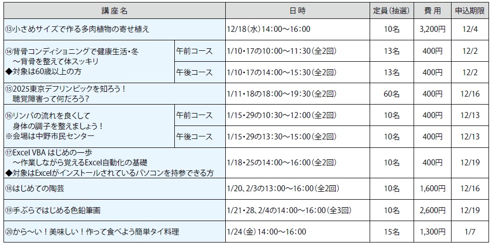 申し込み:往復ハガキ、またはメールに講座名(1講座1通。(4)(14)(16)は希望コースも)と住所・氏名(ふりがな)・年齢・電話番号、市内在勤・在学の方はその旨、往復ハガキは返信面の宛名を書いて、申込期限(必着)までに各センターへ ※抽選結果は申込期限の約10日後に送付します。
