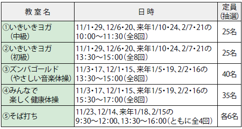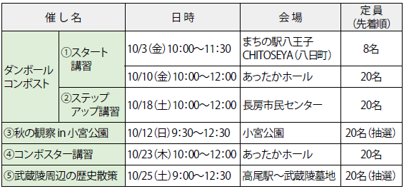 申込方法:往復ハガキ、メール(1教室1通)に教室名((5)は希望時間も)と住所・氏名(ふりがな)・電話番号、往復ハガキは返信面の宛名を書いて、10月3日(必着)までに長房ふれあい館(〒193-0824 長房町588 都営長房アパート西1号棟【電話】669・1433【メール】[email protected])へ